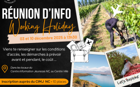 La réunion d’information collective dédiée au Working Holiday, prévue le 10 décembre 2025 à 13h30, affiche désormais complet. Merci à toutes les personnes qui se sont inscrites ! Cette séance permettra aux participants de découvrir : Lieu : Centre Information Jeunesse NC – Centre-Ville Places : toutes réservées Pour celles et ceux qui n’ont pas […]